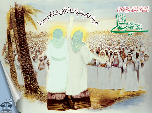 رسول خدا- صلی الله علیه وآله - در روز غدیر خم مردم را برای معرفی علی - علیه السلام - فراخواند و دستور داد زیر درختی كه در آنجا بود، از خار و علف پاك نمایند و مردم امر آن حضرت را به جا آوردند، و آن روز مصادف با روز پنجشنبه بود. سپس مردم را فراخواند دست علی - علیه السلام - را گرفت، بالا برد، تا جایی كه مردم سفیدی زیر بغل او را دیدند، هنوز رسول خدا- صلی الله علیه وآله - و علی(علیه السلام)از همدیگر جدا نشده بودند، این آیه نازل شد: (الیوم اكملت لكم دینكم...)، پیامبر فرمود: خداوند بزرگ است، همان خدایی كه آیین خود را كامل و نعمت خود را بر ما تمام كرد و از نبوت و رسالت من و ولایت علی - علیه السلام - راضی و خشنود گشت و سپس فرمود: خداوندا دوستان او را دوست بدار، و دشمنان او را دشمن بدار، یارانش را یاری كن و آنها را كه یاریش نكردند از یاری خویش محروم بدار[8].